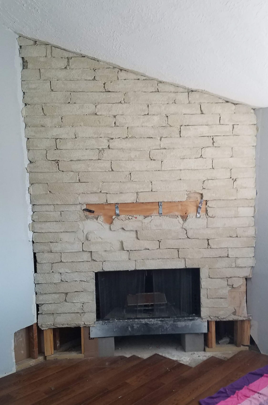 After: Stacked ledgestone wall surround, marble hearth top, and solid cedar mantle.